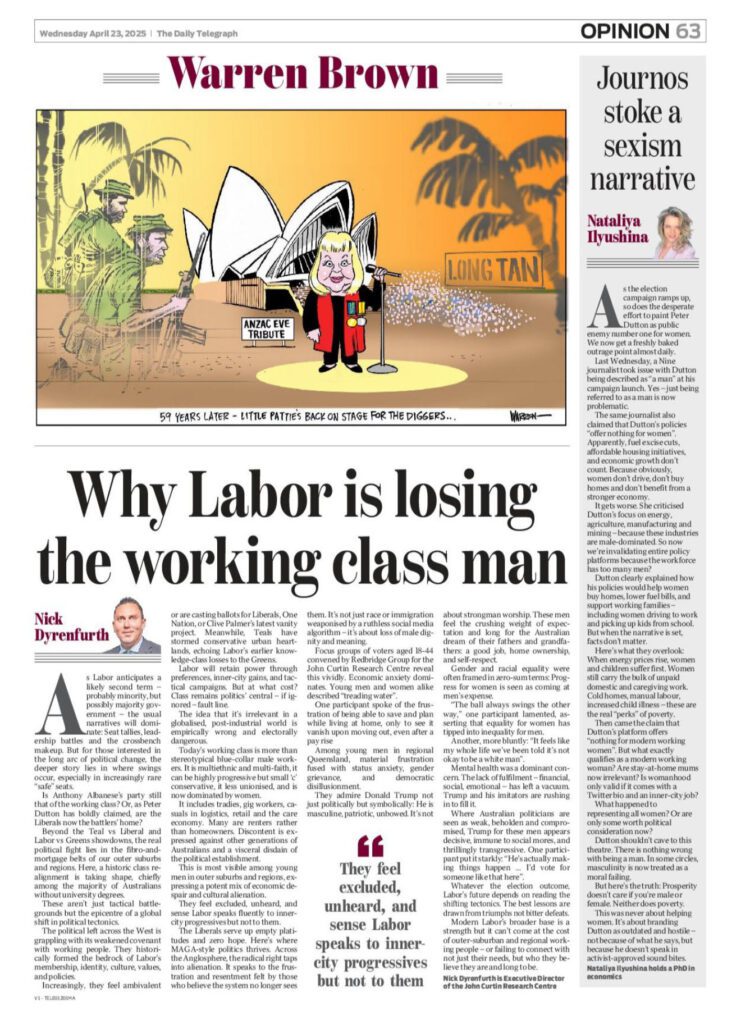 Today’s working class is more than stereotypical blue-collar male workers. It is multi-ethnic and multi-faith, it can be highly progressive but small ‘c’ conservative, it less unionised, and is now dominated by women. It includes tradies, gig workers, casuals in logistics, retail and the care economy. Many are renters rather than homeowners. Discontent is expressed against other generations of Australians and a visceral disdain of the political establishment.
