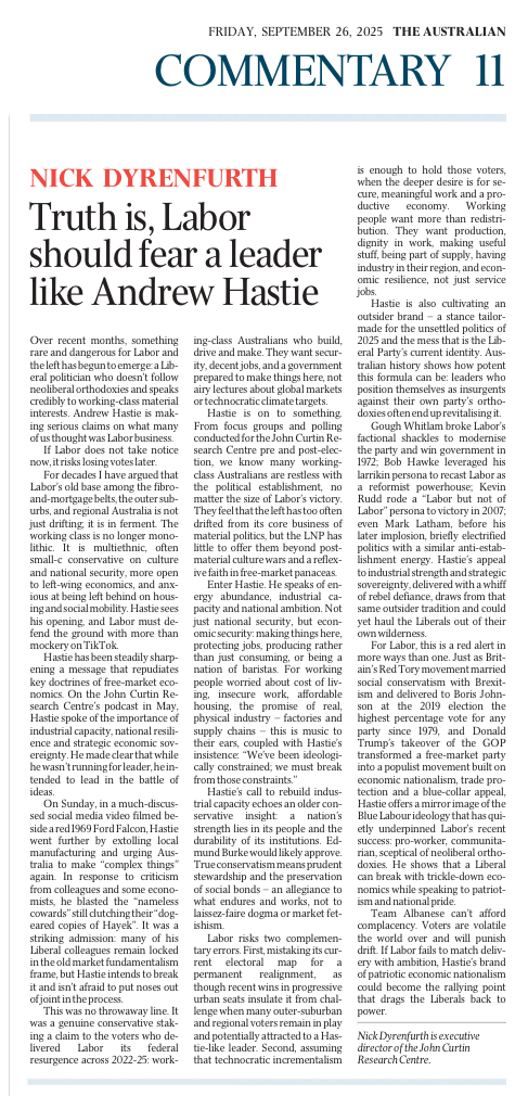 Hastie has been steadily sharpening a message that repudiates key doctrines of free-market economics. On the John Curtin Research Centre’s podcast in May, Hastie spoke of the importance of industrial capacity, national resilience and strategic economic sovereignty.